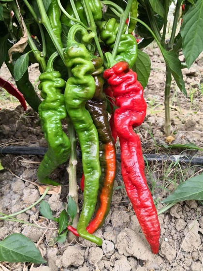 特征特性:雜交種。鮮食。中熟螺絲椒,果皮綠色,基部皺紋,植株生長(cháng)勢中等,始花節位第7~9節;果實(shí)光亮,牛角形,青熟果淺綠色,老熟果果皮紅色;平均縱徑25.7厘米,平均橫徑4.22厘米,平均單果重95.1克。維生素C含量135.4毫克/100克,辣椒素含量0.31%。中抗病毒病CMV,中抗病毒病TMV,感疫病,感炭疽病,耐高溫,不耐高濕。第1生長(cháng)周期畝產(chǎn)3470千克,比對照金豐213增產(chǎn)5.47%;第2生長(cháng)周期畝產(chǎn)3000千克,比對照金豐213增產(chǎn)4.17%。