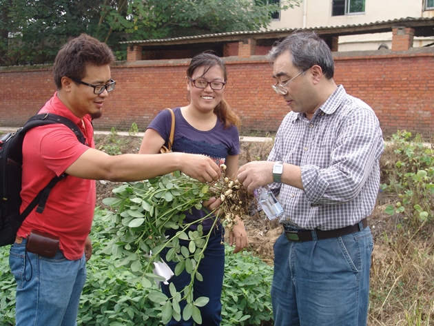 在我院領(lǐng)導段仁周、宋世枝、王青林等的陪同下,張新友副院長(cháng)來(lái)到我院中心試驗園,詳細察看了該院正在開(kāi)展的各類(lèi)花生試驗。在檢查院市合作項目時(shí),張新友副院長(cháng)對273份花生品種資源逐一察看了生長(cháng)情況,了解了種植時(shí)間、田間管理等情況,對花生分期收獲的時(shí)間、收獲方式提出了具體指導意見(jiàn)。張新友副院長(cháng)對信陽(yáng)市農科院多年來(lái)連續開(kāi)展高油酸花生品種選育工作給予了充分肯定。他指出,隨著(zhù)經(jīng)濟社會(huì )的發(fā)展,農業(yè)生產(chǎn)對花生品種的要求不斷提高;ㄉ贩N改良今后一段時(shí)間內的主要目標是高產(chǎn)、優(yōu)質(zhì)、早熟、高含油量、廣適性等,信陽(yáng)農科院要繼續加強花生科研工作,通過(guò)改良品種,創(chuàng )新技術(shù),不斷提高花生種植的經(jīng)濟效益,促進(jìn)信陽(yáng)花生產(chǎn)業(yè)健康、快速發(fā)展。