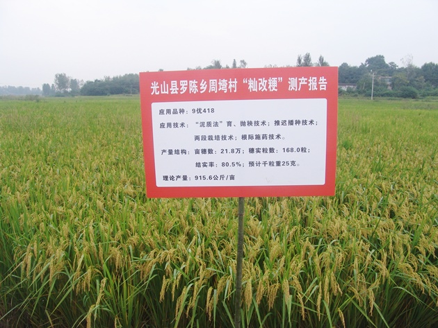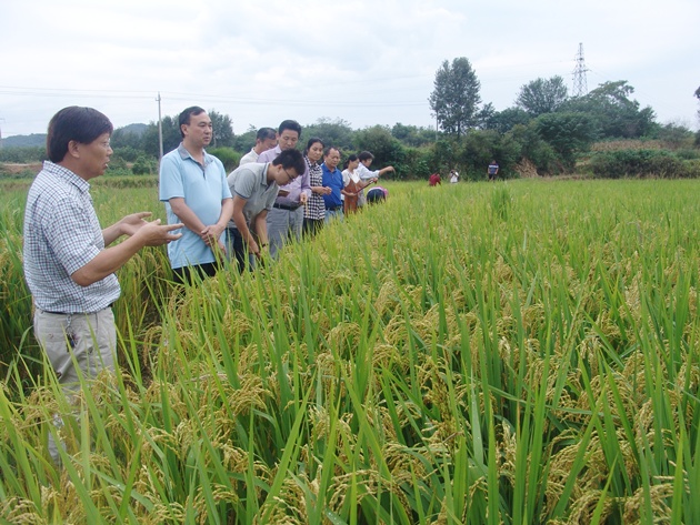 9月20日上午8:10分,在省科技廳駐光山扶貧村周灣村“秈改粳”技術(shù)示范現場(chǎng)觀(guān)摩會(huì )上,我院副院長(cháng)祁玉良研究員向參會(huì )的省科技廳駐周灣村第一書(shū)記陶曼晞及扶貧工作隊、羅陳鄉政府工作人員和周灣村農民代表40余人鄭重宣布:“經(jīng)專(zhuān)家多點(diǎn)取樣測產(chǎn),周灣村核心示范區粳稻理論畝產(chǎn)量915.6公斤,按85折后預計每畝實(shí)收稻谷778.3公斤”。
