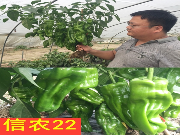 “信農22”《登記編號:GPD辣椒(2019)410719》屬雜交種,中早熟,全生育期163天,始收期66天;果型牛角形,青熟果綠色,老熟果紅色;中抗疫病,抗炭疽病,較耐高溫,2014年進(jìn)行區域試驗,2015年進(jìn)行生產(chǎn)試驗,2016年進(jìn)行展示示范,并推廣種植,平均畝產(chǎn)5570千克,比對照優(yōu)美增產(chǎn)5.78%。適宜在河南春季大棚種植。