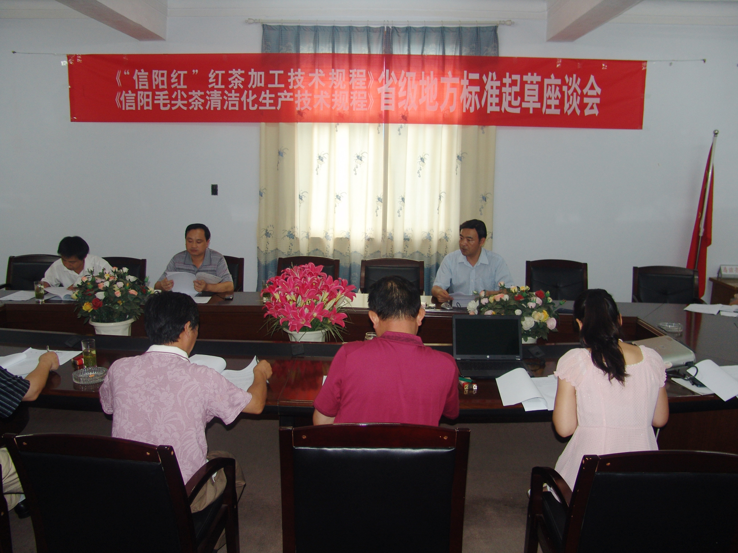 8月16日,《“信陽(yáng)紅”紅茶加工技術(shù)規程》、《信陽(yáng)毛尖茶清潔化生產(chǎn)技術(shù)規程》省級地方標準起草研討會(huì )在我所召開(kāi)。市茶產(chǎn)業(yè)辦公室副主任夏國宗,副所長(cháng)宋世枝以及我市茶葉專(zhuān)家和信陽(yáng)五云茶葉(集團)有限公司等主要茶葉企業(yè)技術(shù)負責人出席會(huì )議,河南省茶葉工程技術(shù)研究中心主任、所茶葉專(zhuān)家呂立哲研究員主持研討會(huì )。
