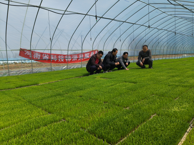 羅山縣秋滿(mǎn)倉農機專(zhuān)業(yè)合作社是全國農機專(zhuān)業(yè)合作社示范社,建有育秧大棚60多座,為周邊農戶(hù)提供再生稻育插秧服務(wù)。今年已育再生稻秧苗10多萬(wàn)盤(pán),可以栽插8000多畝大田,最早的一批秧苗已處在離乳期,2周后就可以栽插了。扶定研究員告訴該合作社負責人,豫南再生稻可實(shí)現“一稻收兩季、一畝產(chǎn)噸糧”,是豫南稻區增產(chǎn)增效最為顯著(zhù)的種植模式,也是契合2024年中央一號文件強調的“把糧食增產(chǎn)的重心放到大面積提高單產(chǎn)上”的重要技術(shù)措施。再生稻育秧是關(guān)鍵基礎環(huán)節,通過(guò)集中育秧社會(huì )化服務(wù)能有效降低風(fēng)險,保障技術(shù)落實(shí),促進(jìn)成果轉化,能更好的促進(jìn)再生稻發(fā)展。合作社要圍繞良法,聚焦重點(diǎn)環(huán)節,形成促進(jìn)水稻大面積均衡增產(chǎn)的高效模式,支撐區域內農業(yè)發(fā)展。