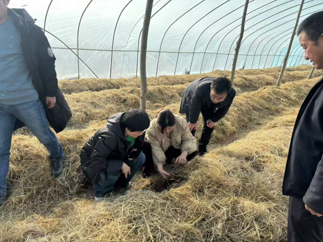 寒冬臘月,河南優(yōu)特計劃項目“稻-菇”輪作項目示范的大球蓋菇播種已經(jīng)結束,大球蓋菇正在發(fā)菌中。1月6日晚,叮鈴鈴、叮鈴鈴,一陣急促的電話(huà)鈴聲響起,河南優(yōu)特產(chǎn)業(yè)食用菌專(zhuān)項團隊、我院豫東南片區“稻-菇”輪作技術(shù)任務(wù)負責人龔鳳萍接通了電話(huà)。“喂,龔老師,您好!我是潢川川香家庭農場(chǎng)張建松。我的大球蓋菇地里菌絲長(cháng)不動(dòng),還有個(gè)別地方出現米黃色的小顆粒,您幫忙看看怎么回事吧?”接到電話(huà)后,龔鳳萍迅速聯(lián)系了河南優(yōu)特產(chǎn)業(yè)食用菌專(zhuān)項團隊專(zhuān)題負責人聞亞美老師。1月7日上午,聞亞美老師、龔鳳萍老師、潢川縣農科所副所長(cháng)汪偉組成省、市、縣三級科研服務(wù)隊前往潢川縣魏崗鎮,潢川川香家庭農場(chǎng)負責人張建松已在地頭焦急地等著(zhù)。