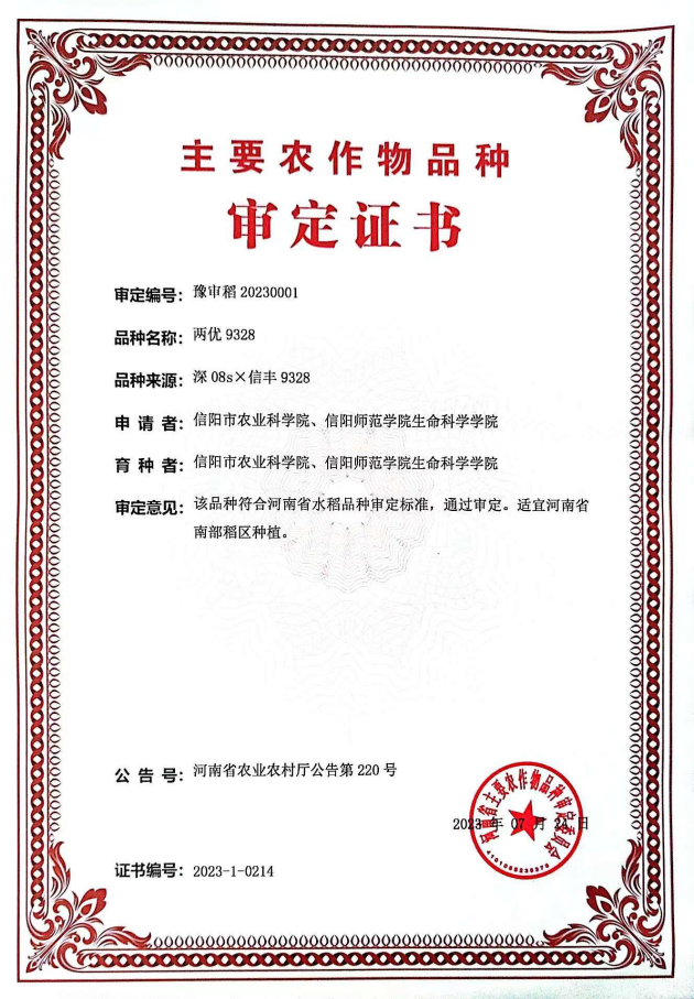 在第九屆河南省主要農作物品種審定委員第一次主任審定會(huì )議上,審定通過(guò)了由我院主持選育的水稻新品種兩優(yōu)9328、信優(yōu)糯1108和金兩優(yōu)9328。上述3個(gè)水稻新品種的育成并通過(guò)審定,再一次彰顯了我院雄厚的水稻科研實(shí)力,進(jìn)一步豐富了河南省水稻品種結構,為豫南稻區水稻生產(chǎn)提質(zhì)增效和促進(jìn)種業(yè)發(fā)展提供了有力的品種支撐。