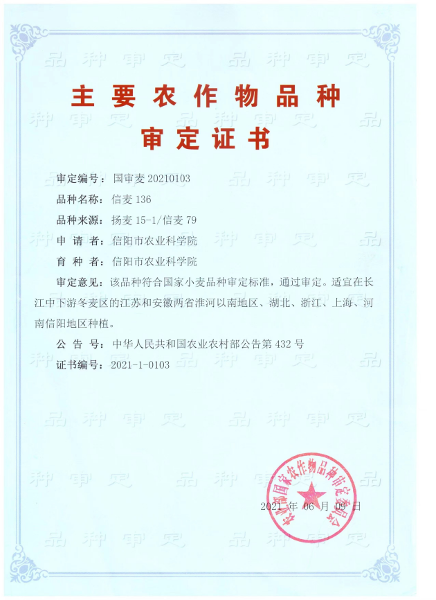 9月25號,我院選育的國審小麥新品種“信麥136”生產(chǎn)經(jīng)營(yíng)權以35萬(wàn)的價(jià)格成功轉讓給信陽(yáng)市嘉田農業(yè)科技有限公司。下一步,我院將以此為契機,探索選育水平更高、適應市場(chǎng)需求的小麥新品種,并積極開(kāi)展新品種新技術(shù)的示范推廣,多渠道多途徑尋求科技成果轉化,讓科技成果落地生根,推動(dòng)小麥及農業(yè)產(chǎn)業(yè)的高質(zhì)量發(fā)展和種業(yè)振興。